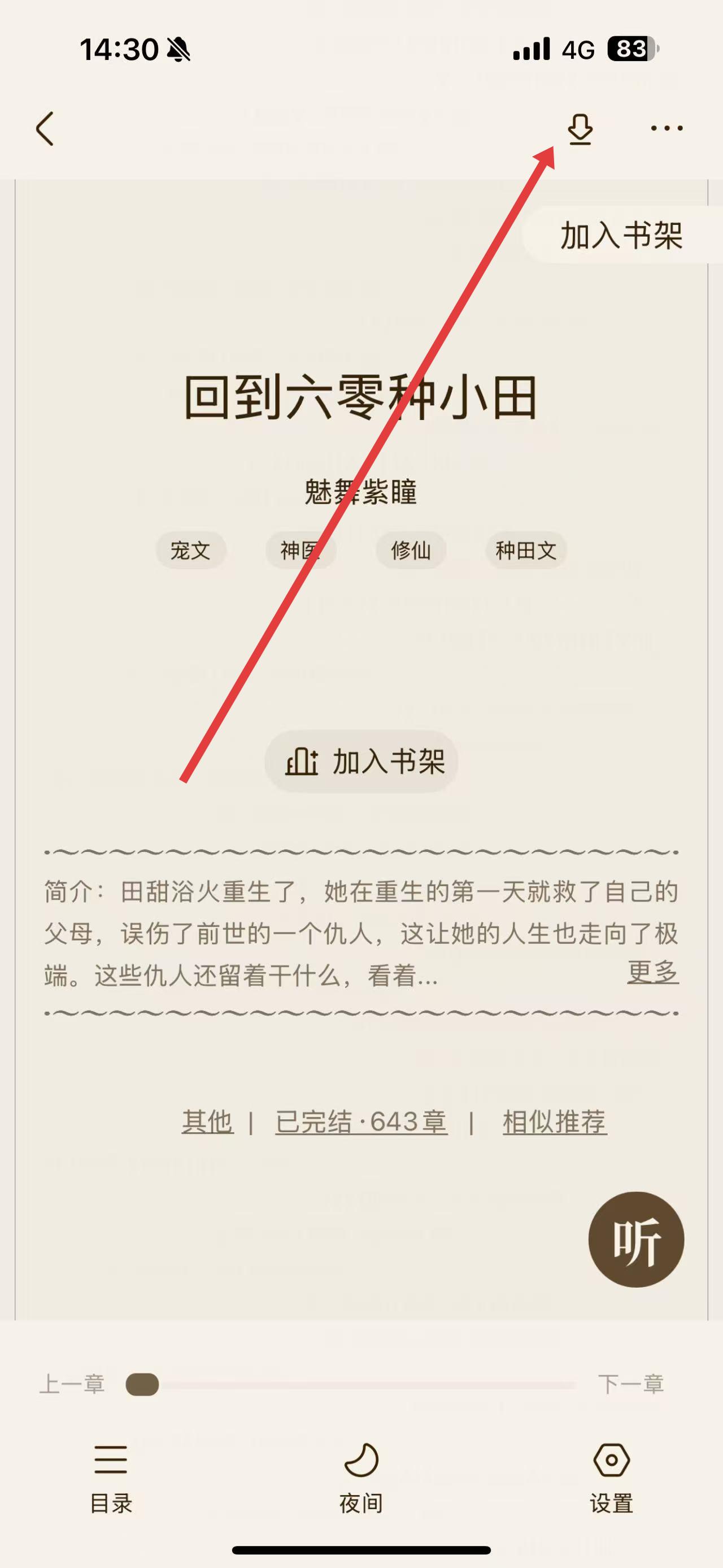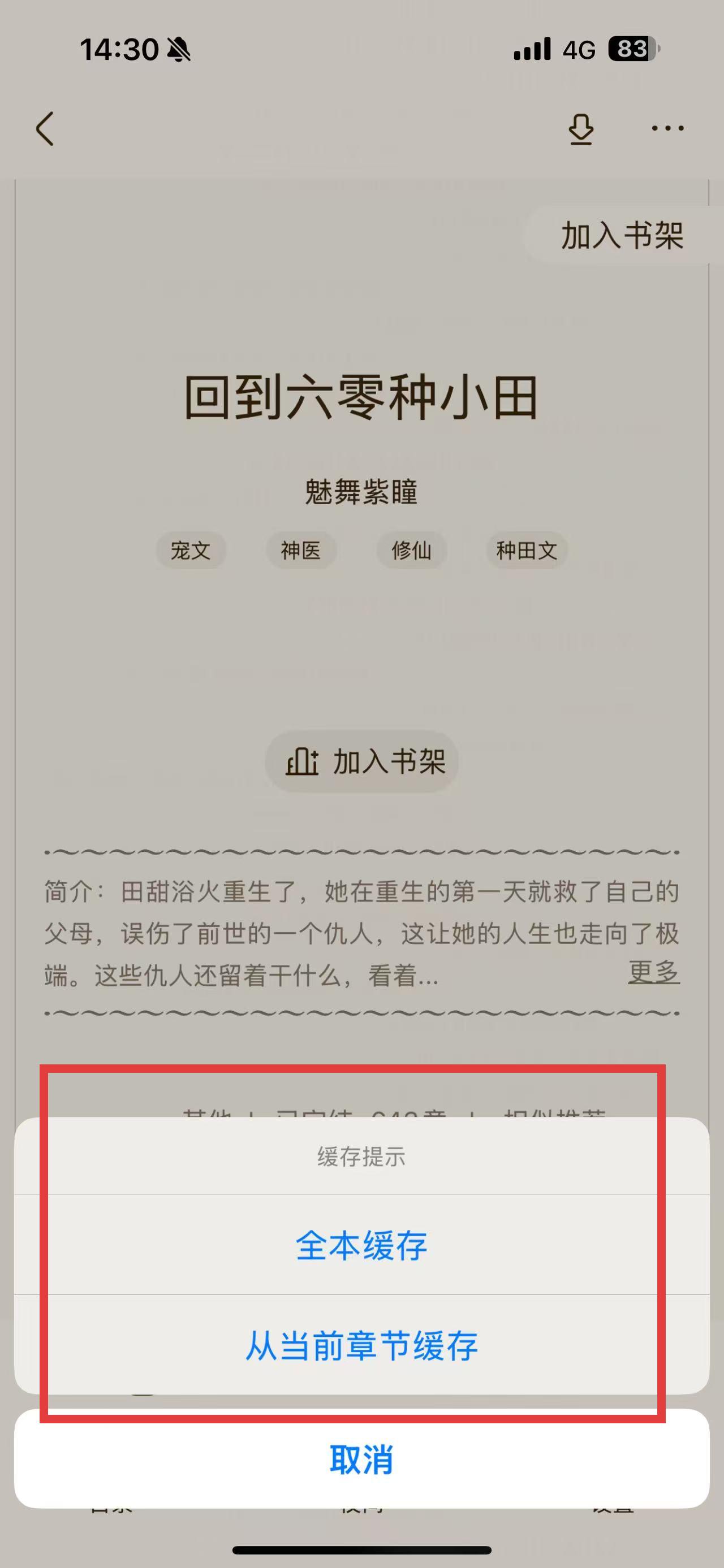 2、在书籍详情页,点击页面上方的下载图标,唤起缓存选项。