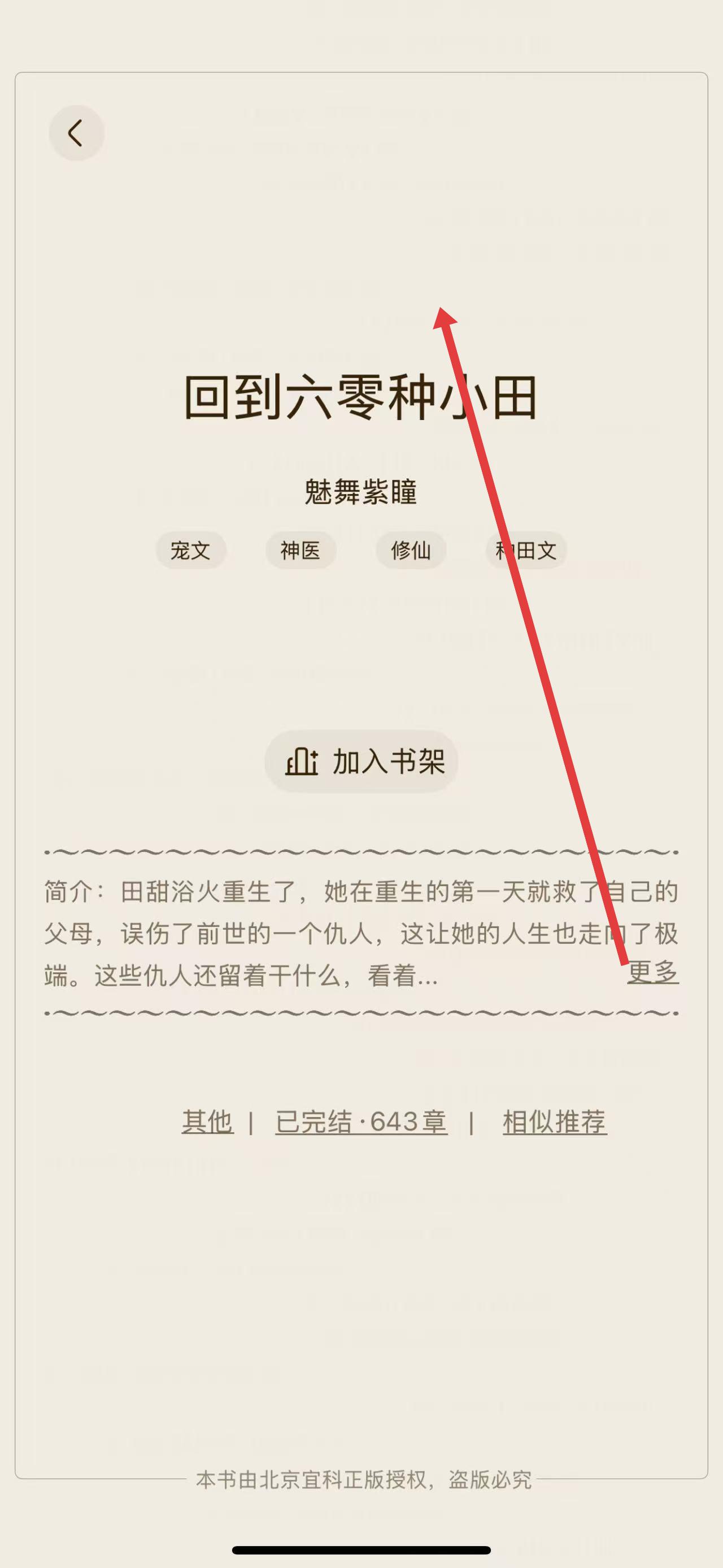 1、打开阅读回到六零种小田的界面,进入书籍详情页。