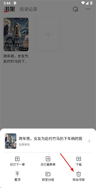 3、在书籍操作菜单中点击移出书架选项,完成该书籍移出书架的操作。