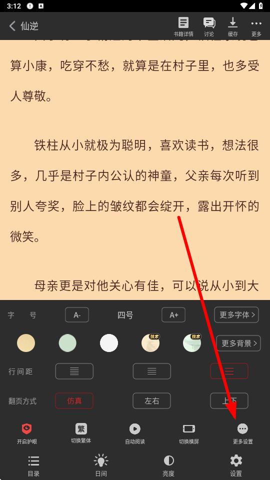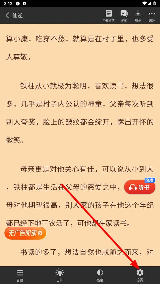 1、在追书神器中打开小说阅读界面,点击底部的设置按钮齿轮图标。