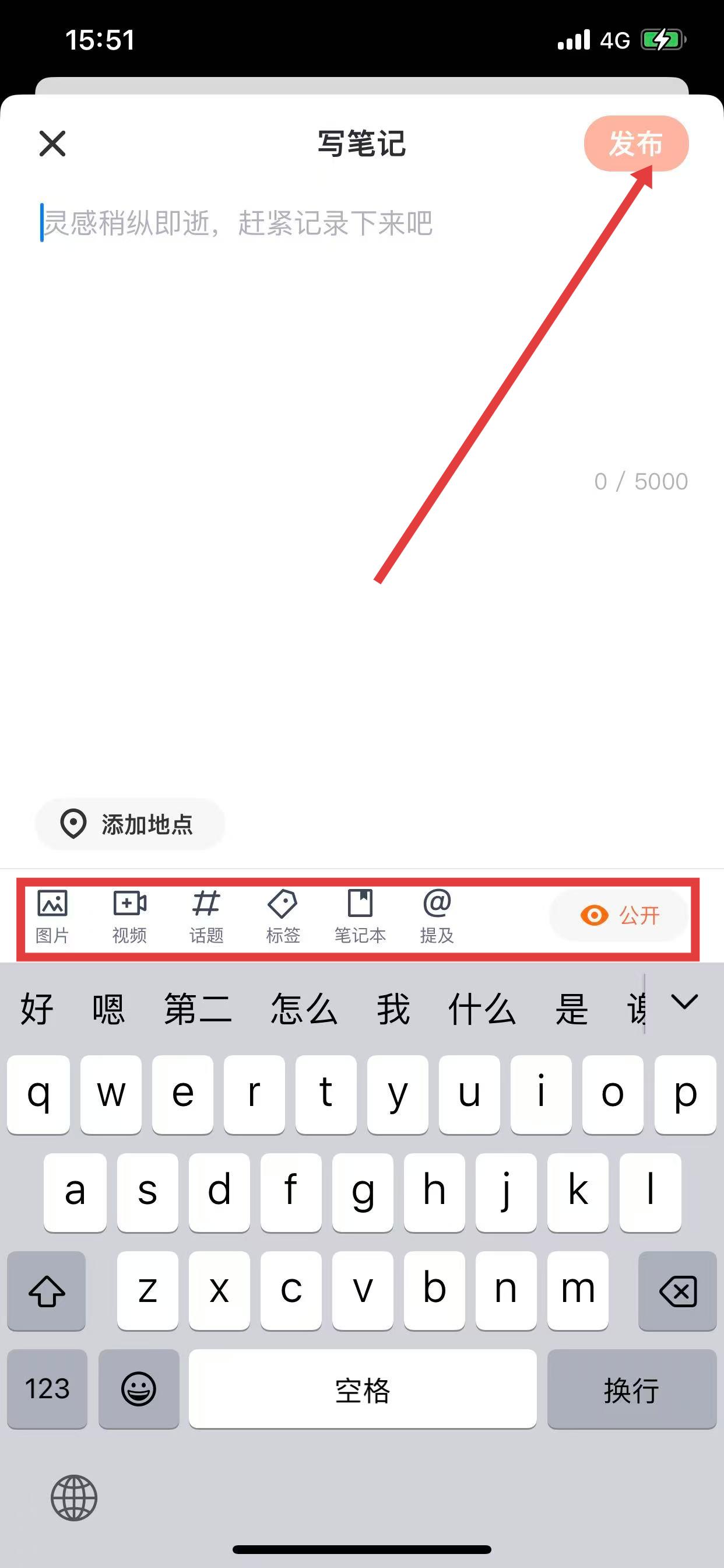 3、输入想要发布的动态内容 ,添加图片、视频,带上话题、标签,选择笔记本分类、设置公开或私密状态等,点击发布按钮。