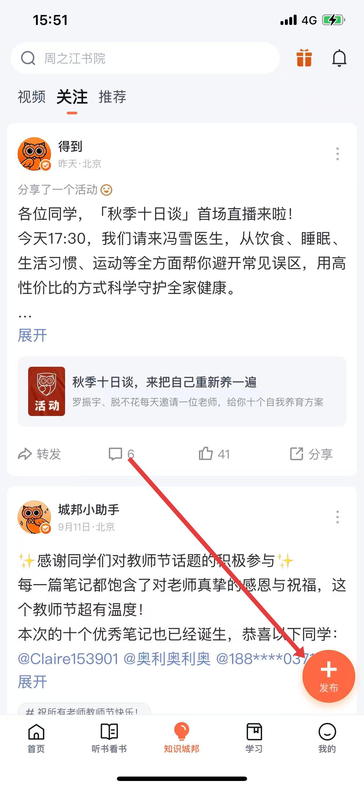 2、进入“知识城邦”页面后,点击右下角的+发布按钮。