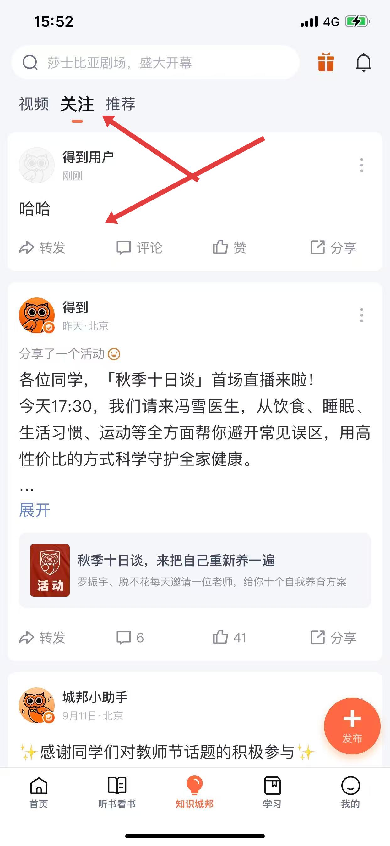 4、成功发布后,就能够在关注列表中看到刚刚发布的动态内容。