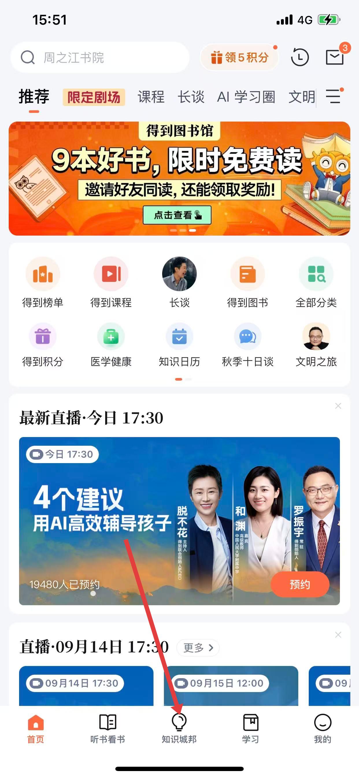 1、打开得到App,点击底部导航栏中的知识城邦图标。