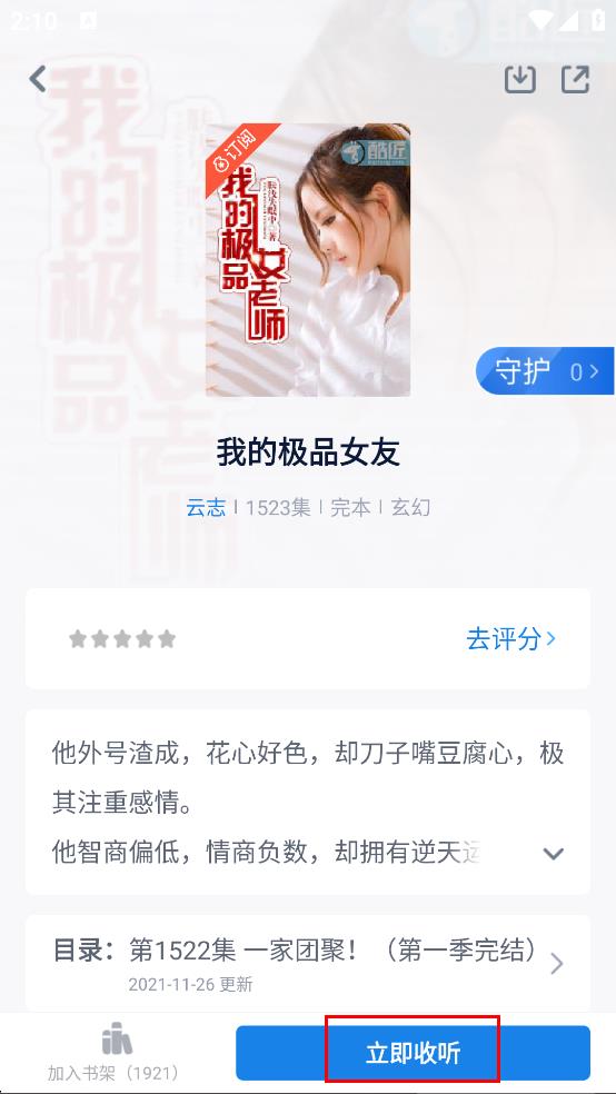 3、在作品详情页,点击立即收听,进入播放列表页面。