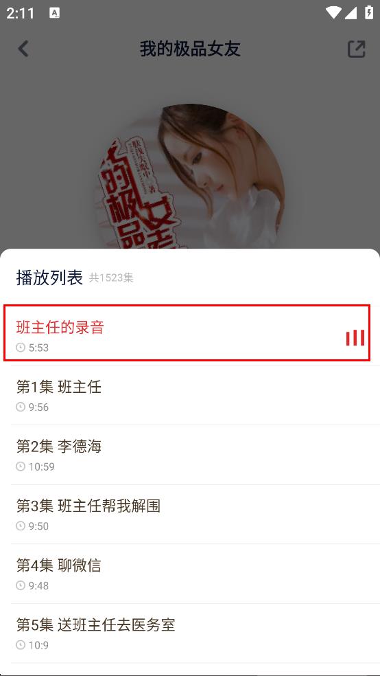 4、在播放列表页面,选择集数,如班主任的录音,开始收听。