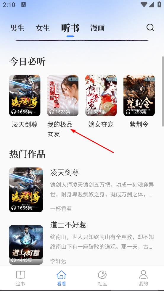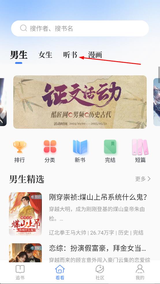 1、进入首页,在看看页面,点击听书,进入听书页面。