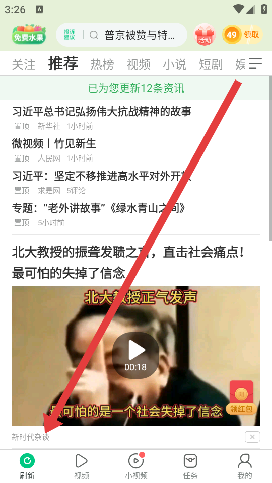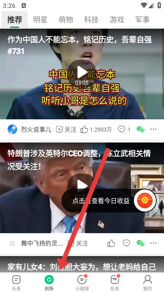 1、进入趣头条app后,可以选择点击底部导航栏的刷新,获取最新资讯内容,如时事观点、热点视频等。