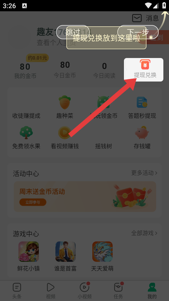 2、进入我的页面,可以选择点击提现兑换的按钮,处理金币提现、奖励兑换等收益相关的操作。