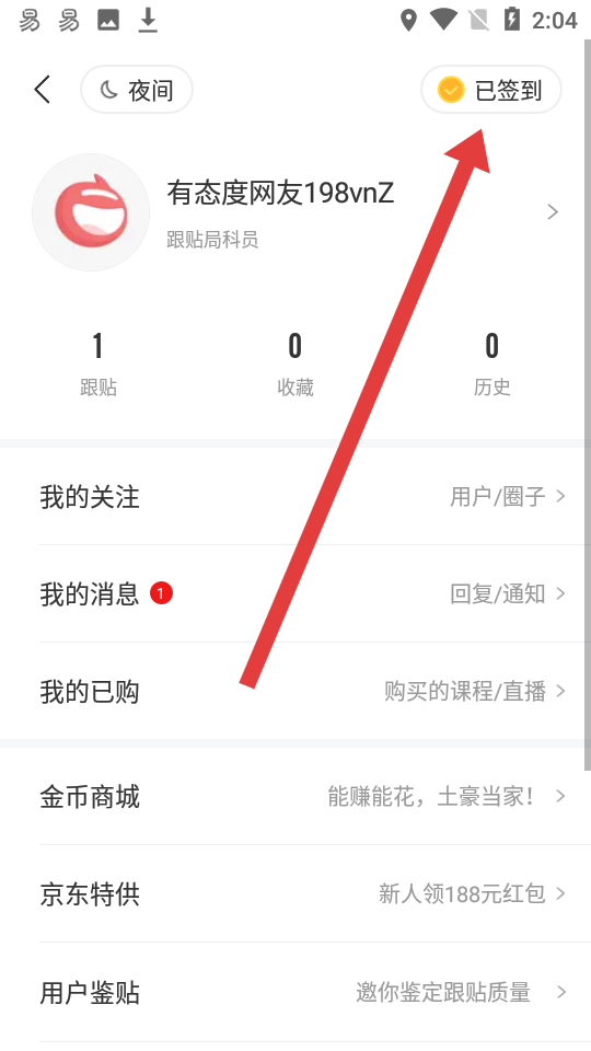 2、进入我的页面之后,找到右上角的签到相关按钮,点击进入签到页面。