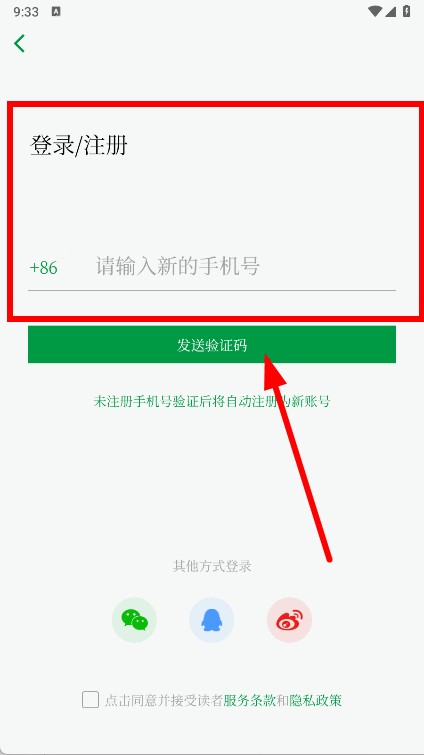 4、输入手机号码,点击发送验证码按钮,获取并输入验证码,勾选后,即可注册登录操作。