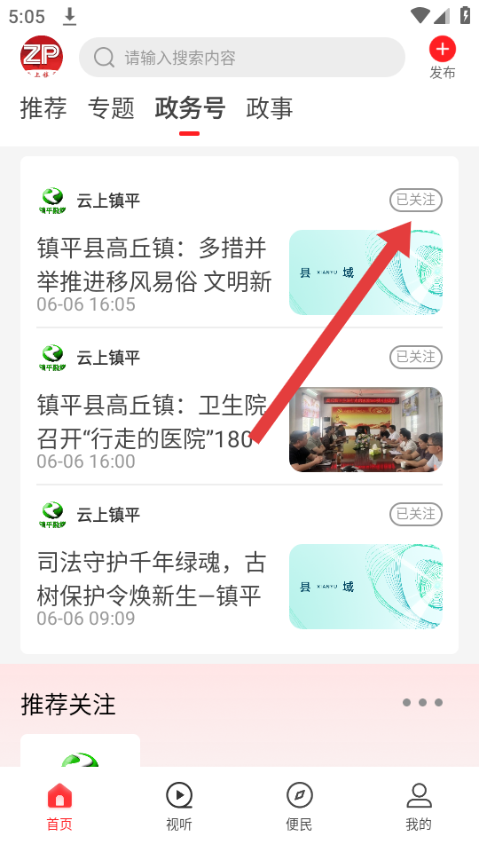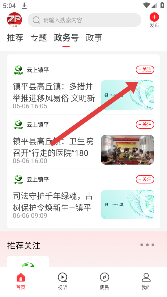 2、在政务号列表中,找到想要关注的政务号条目如云上镇平发布的内容,点击其右侧的+关注的按钮。