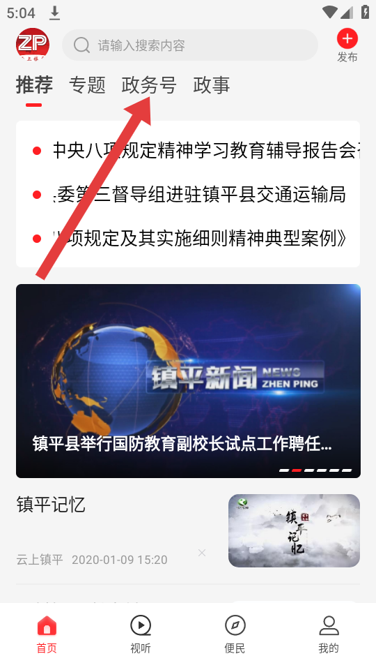 1、打开云上镇平APP,需要在首页顶部导航栏,点击政务号的选项,进入政务号的展示页面。