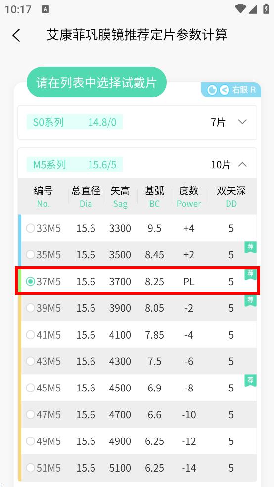 3、在试戴片选择页面,选择合适的试戴片,如37M5。