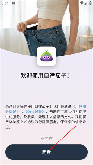 1、在自律茄子的欢迎页面,点击同意,进入应用首页。