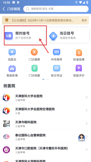 2、在门诊就医页面,点击预约挂号选项,进入找医院页面。