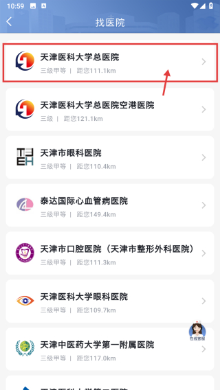 3、在找医院页面,选择天津医科大学总医院,进入医院科室列表页面。