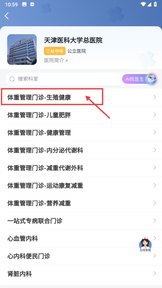 4、在医院科室列表页面,选择体重管理门诊-生殖健康科室,推进挂号流程。