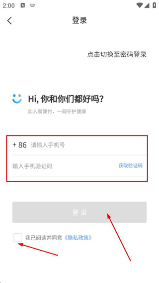 3、输入手机号、验证码,勾选隐私政策,点击登录。