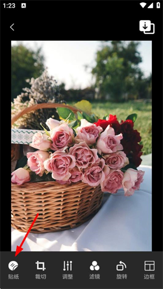 3、在图片编辑页面,点击贴纸选项,进入贴纸选择界面。