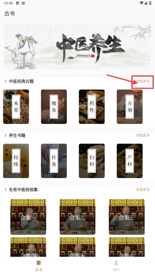 1、打开中医古籍类APP,在首页点击中医经典古籍”栏目右侧的查看更多,进入中医经典古籍列表页。