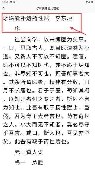 4、在详情页中,阅读李东垣所著珍珠囊补遗药性赋序的中医古籍内容。