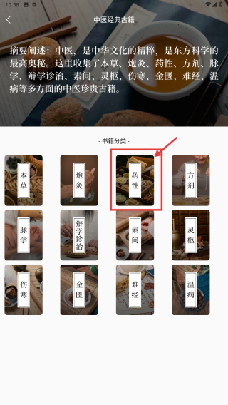 2、在列表页中,点击药性分类,进入药性古籍内容列表。