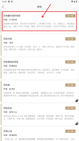 3、在内容列表中,点击珍珠囊补遗药性赋条目,进入该古籍详情页。