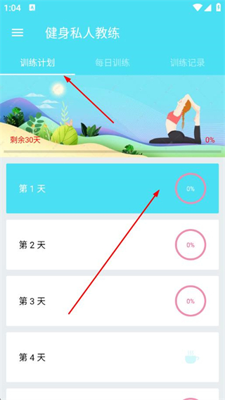 1、打开健身私人教练APP,在训练计划页面选择要进行的训练天数。