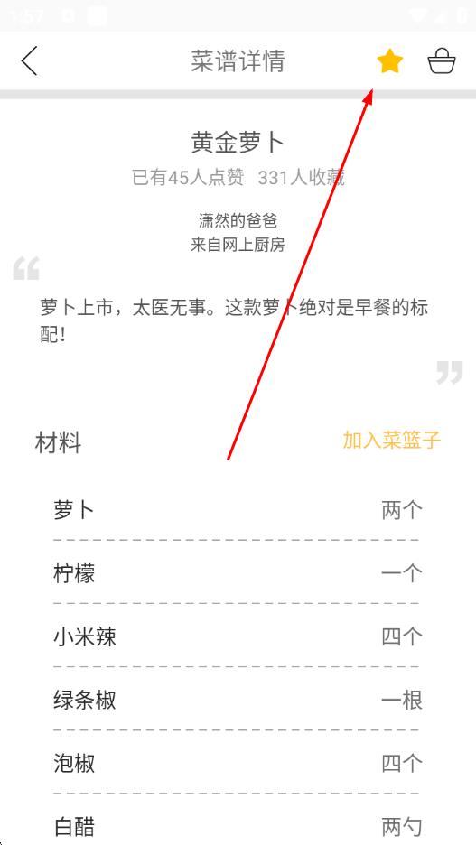 4、在菜谱详情页面,点击右上方的黄色星星图标,即表示该菜谱文章已成功收藏。
