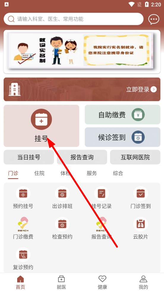 1、打开甘肃妇幼APP,点击底部「就医」模块,在功能区找到「挂号」按钮并点击,开启预约挂号流程。