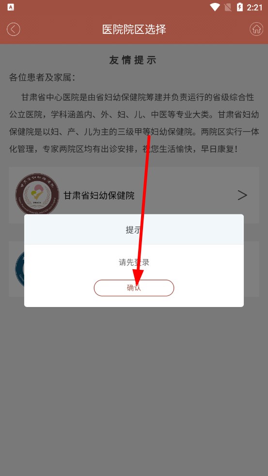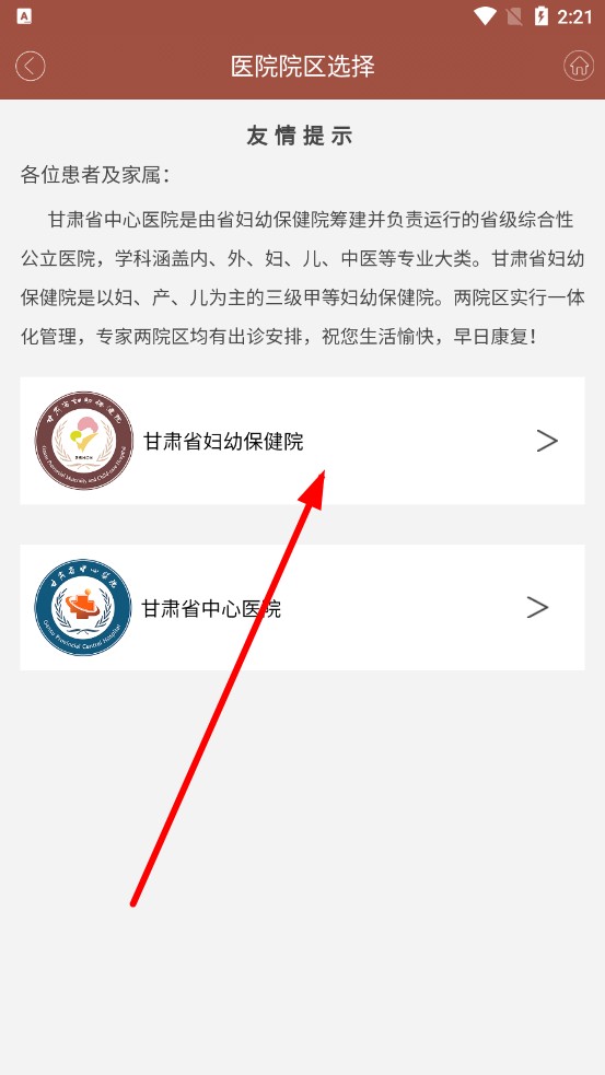 2、跳转至院区选择页面,可选择「甘肃省中心医院」或者「甘肃省妇幼保健院」选项,点击进入。