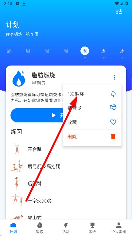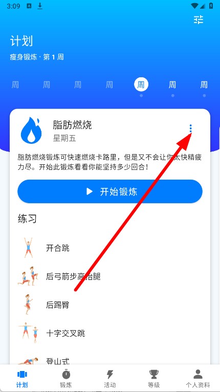 2、找到脂肪燃烧锻炼项目,点击其右上角的三点菜单按钮,弹出操作选项。