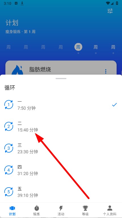 4、根据需求选择目标循环次数,完成脂肪燃烧锻炼循环次数的设置。