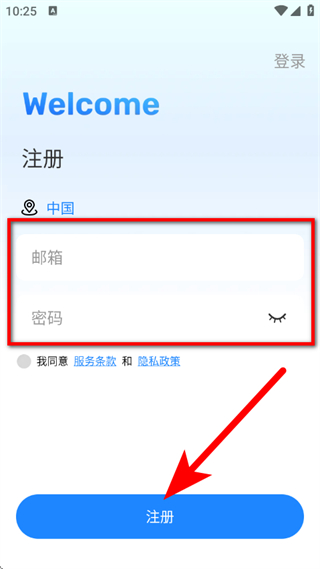 3、在注册页面,输入邮箱和密码,勾选后,点击注册。