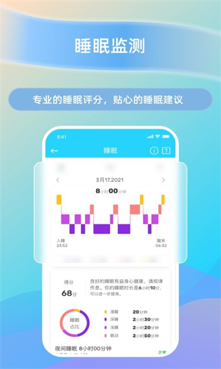 2、深度监测睡眠周期,统计睡眠时长与睡眠质量评分,生成睡眠分析报告并提供改善建议,夜间异常苏醒时同步记录,全面了解睡眠状况,针对性调整作息习惯。