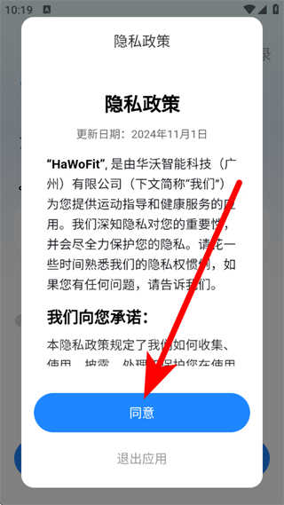 1、打开HaWoFit,在弹出隐私页面,点击同意,进入登录界面。