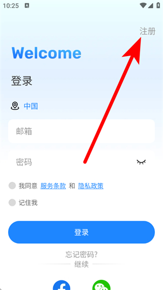 2、在登录界面,点击右上角注册,切换至注册页面。