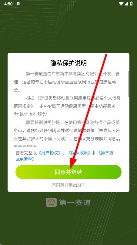 1、打开第一赛道,在弹窗中点击同意并继续,进入主界面。