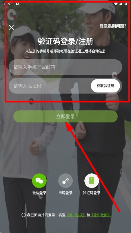 4、选择验证码登录注册方式,勾选后,点击立即登录按钮,完成注册登录操作。