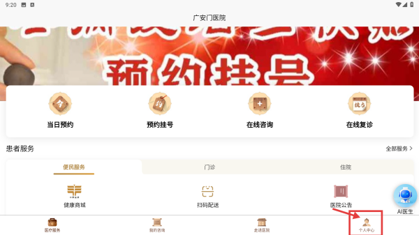1、打开广安门医院医疗服务APP,点击右下角个人中心选项,进入个人中心页面。