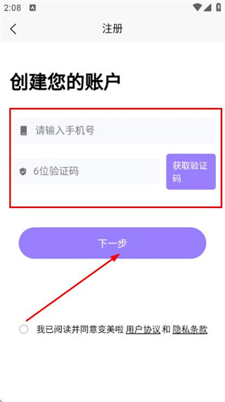 2、在注册界面输入手机号和验证码,点击下一步。