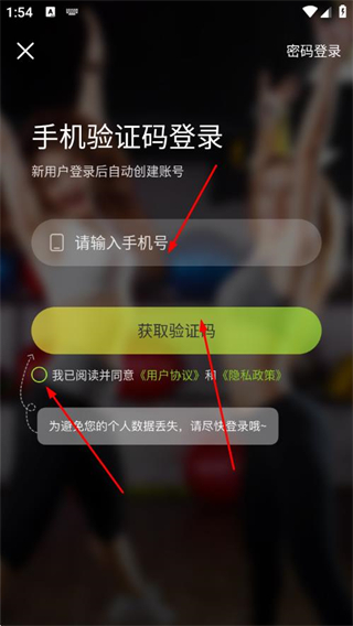 3、在登录界面选择手机验证码登录,输入手机号,勾选协议,点击获取验证码。