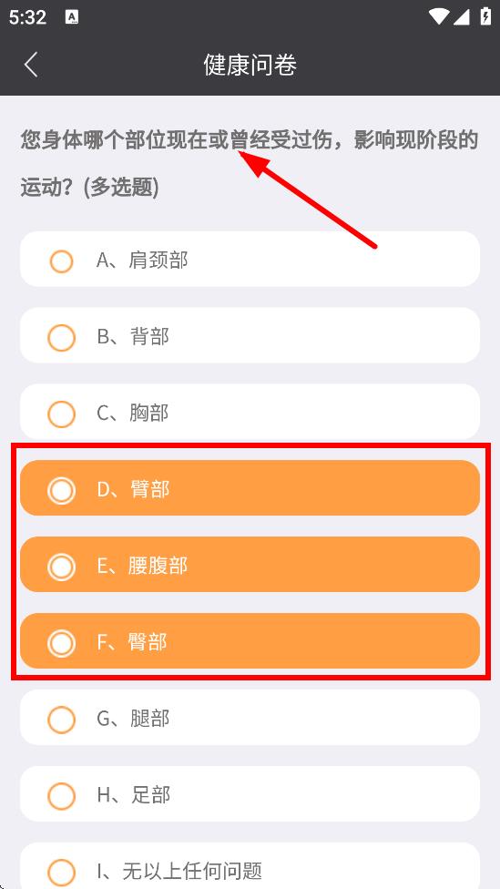 4、继续在健康问卷页面,选择身体受伤部位相关选项。