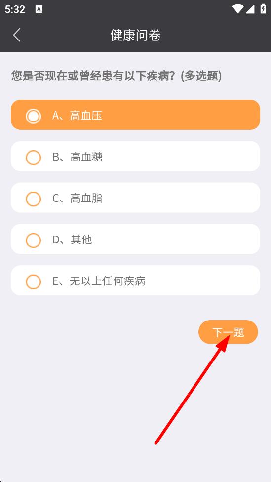 3、进入健康问卷页面,选择疾病相关选项后,点击下一题。