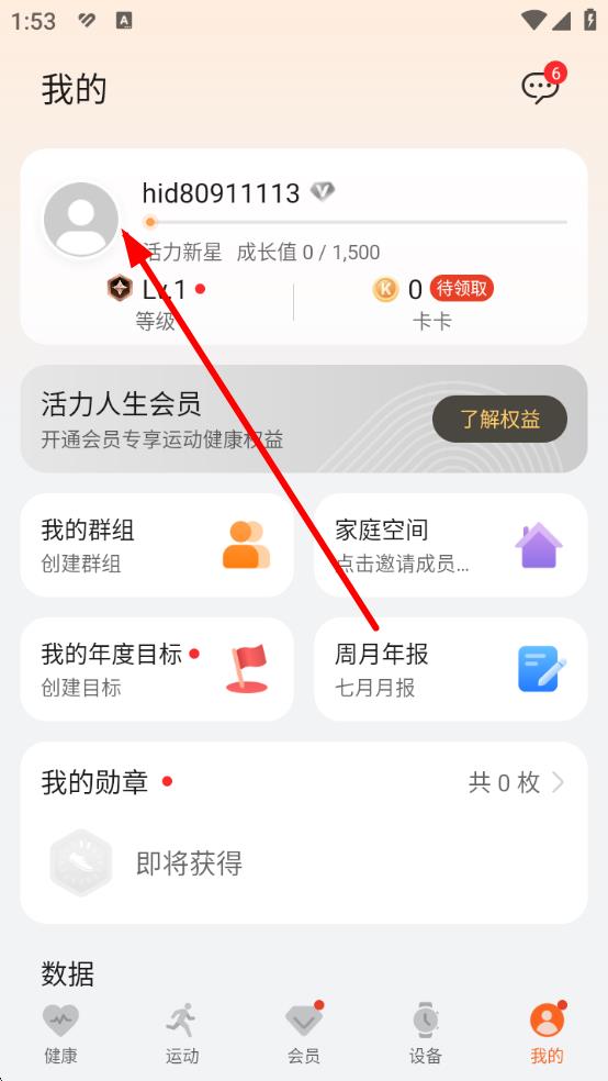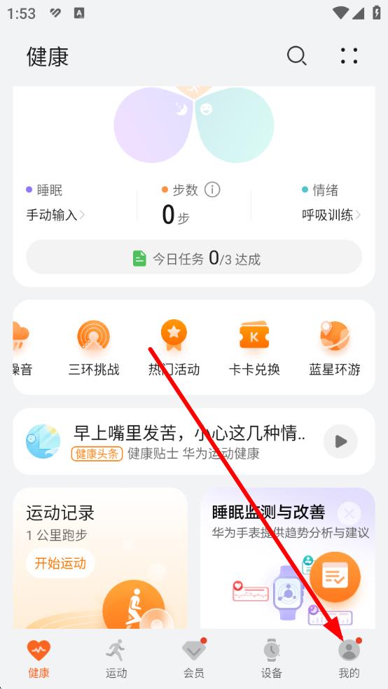 1、打开华为运动健康App,进入首页,点击底部导航栏最右侧的我的选项,进入个人中心页面。