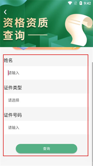 3、在资格资质查询页面,填写姓名、证件信息后点击查询查看证书。