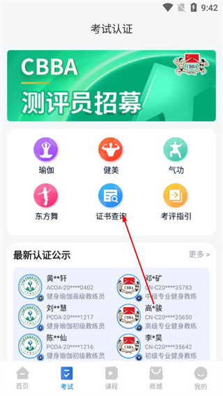 2、进入考试认证页面,找到并点击证书查询选项。