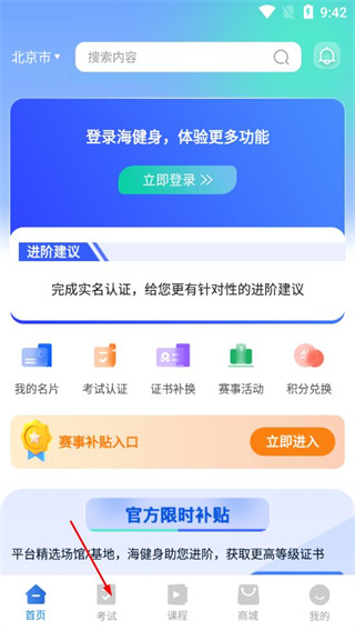1、在海健身的首页,点击底部的考试选项。