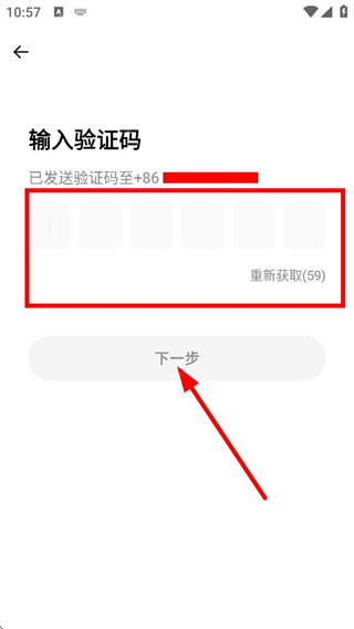 4、在验证码输入页面,输入收到的验证码后点击下一步,完成注册操作。